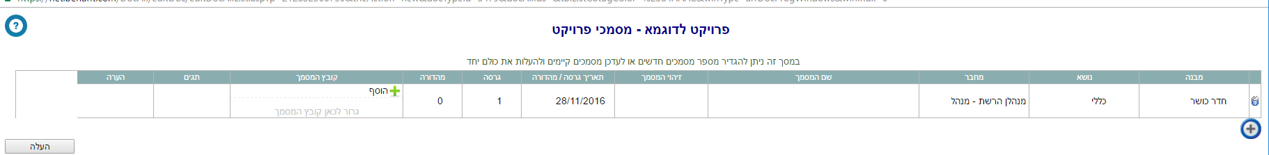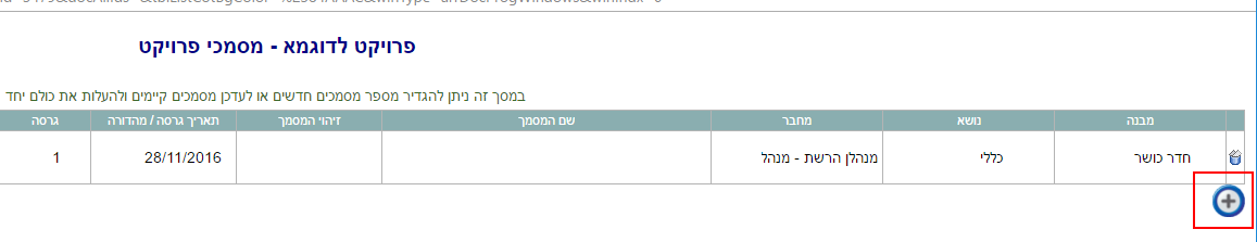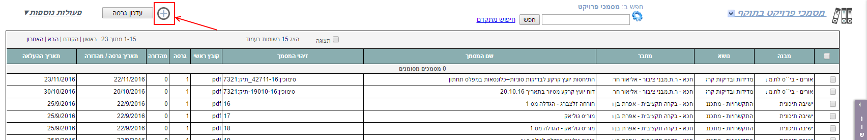 2. נפתחת רשימת מסמכי הפרויקט. ללחוץ בצד שמאל על כפתור ההוספה (הפלוס):