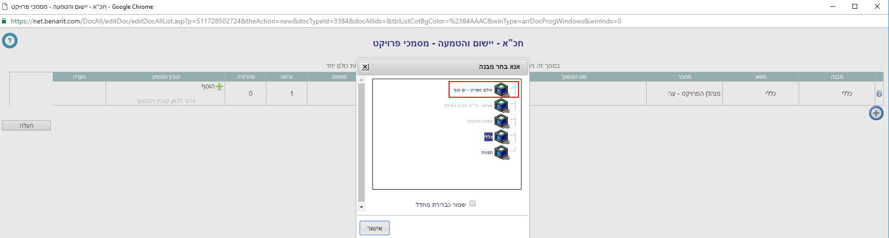 3. נפתחת חלונית להעלאת מסמך חדש ובקדמת המסך קופצת חלונית לבחירת המבנה. לסמן את המבנה הרצוי וללחוץ על “אישור“: