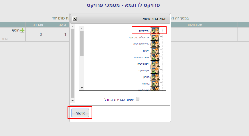 4. נפתחת חלונית לבחירת הנושא. לסמן את הנושא הרצוי וללחוץ על “אישור“: