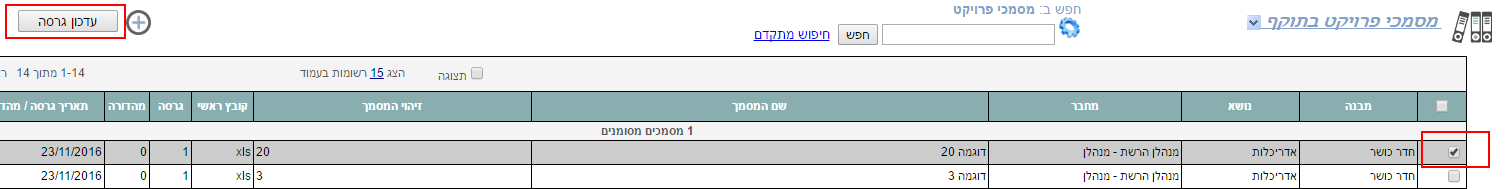 7. כדי לעדכן גרסה של מסמך קיים, יש לסמן את המסמך שרוצים לעדכן ברשימת מסמכי הפרויקט, ואז ללחוץ למעלה על הכפתור “עדכן גרסה“: