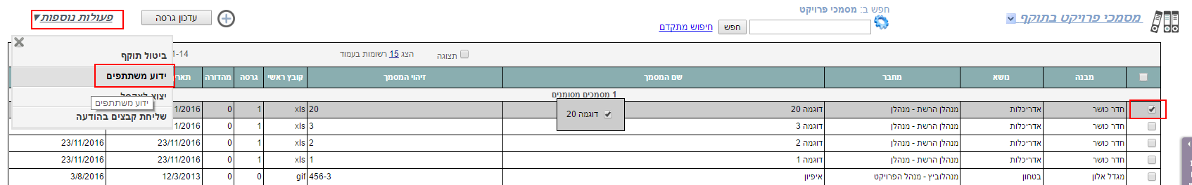 8. כדי לשלוח הודעה למשתתפי הפרויקט על העלאה או עדכון של מסמך, יש לסמן את המסמך ברשימת מסמכי הפרויקט, ואז בצד שמאל לפתוח את תפריט הפעולות ולבחור “יידוע משתתפים“: