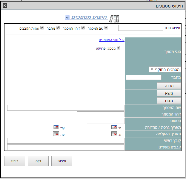 נפתחת חלונית להגדרת פרמטרים לחיפוש. ניתן לחפש מסמך לפי שמו, זיהויו, מחבר המסמך, תאריך, מבנה, נושא: