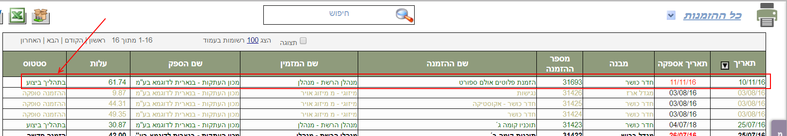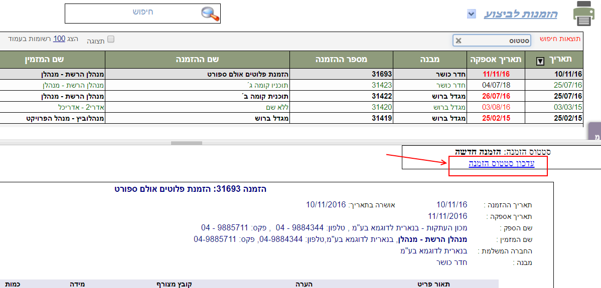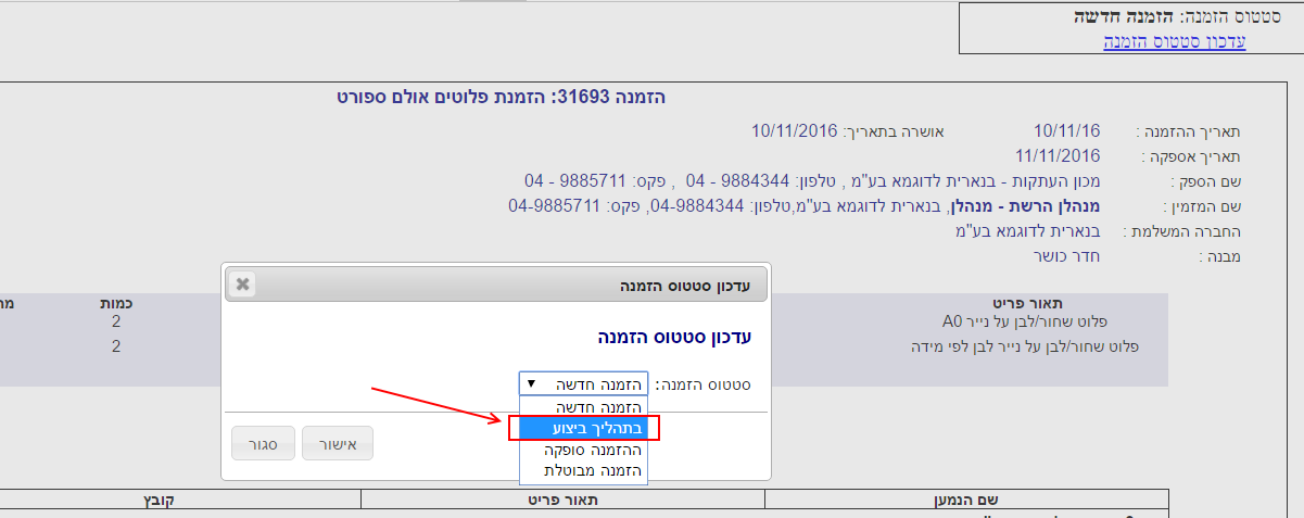 הסטטוסים שניתן לבחור מהם הם: “בתהליך ביצוע“, “ההזמנה סופקה“, או “ההזמנה מבוטלת“.