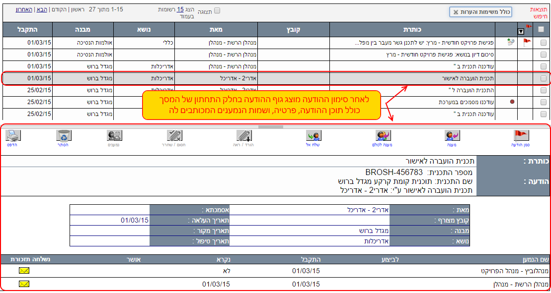 בחלון המרכזי מופיעה רשימת הודעות. לגבי כל הודעה ניתן לראות בין היתר את כותרת ההודעה, ממי נשלחה, ומתי התקבלה.